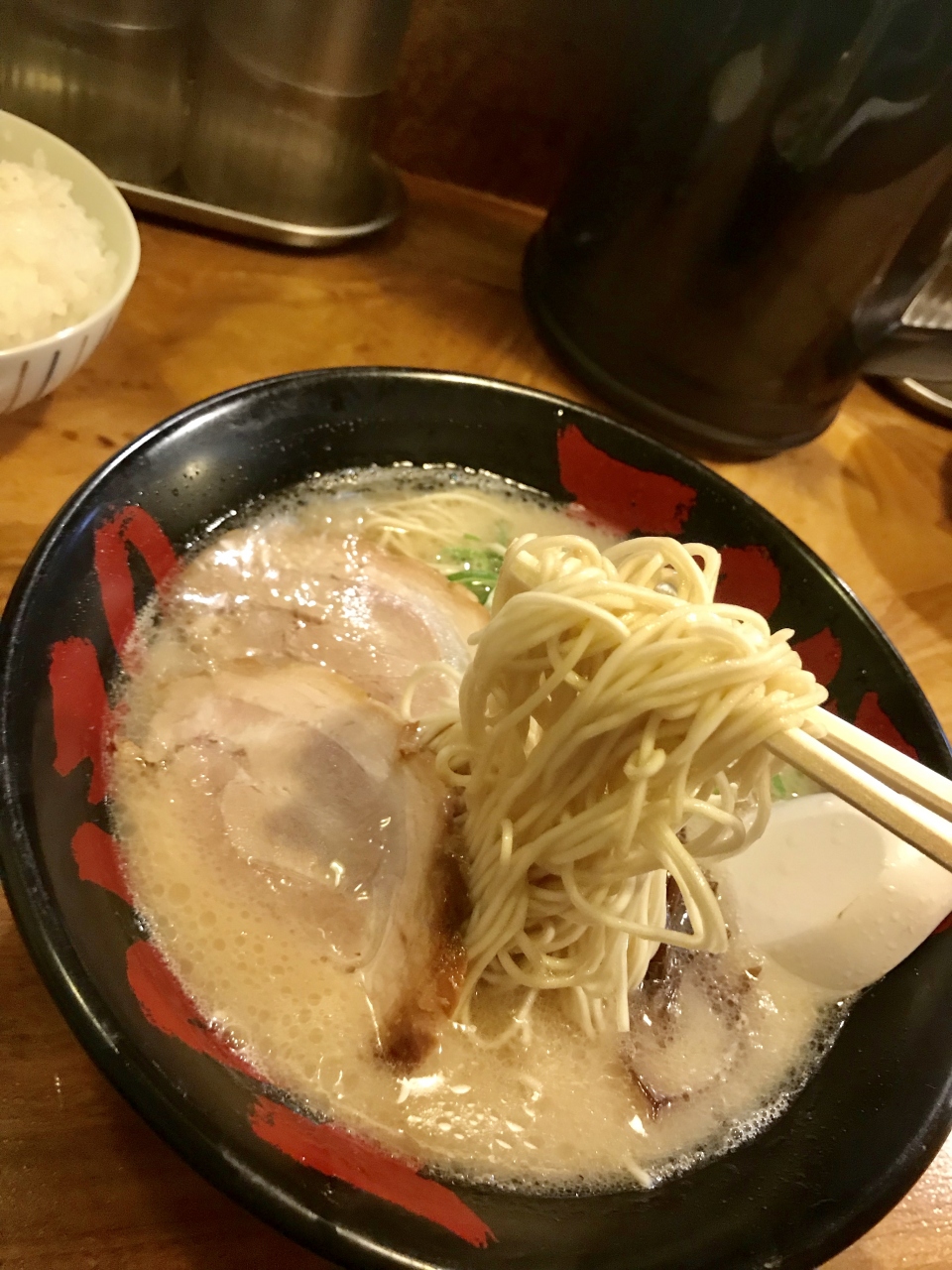 ラーメン作りを拝見していると・・・昔ながらの「博多ラーメン」を作る工程です。