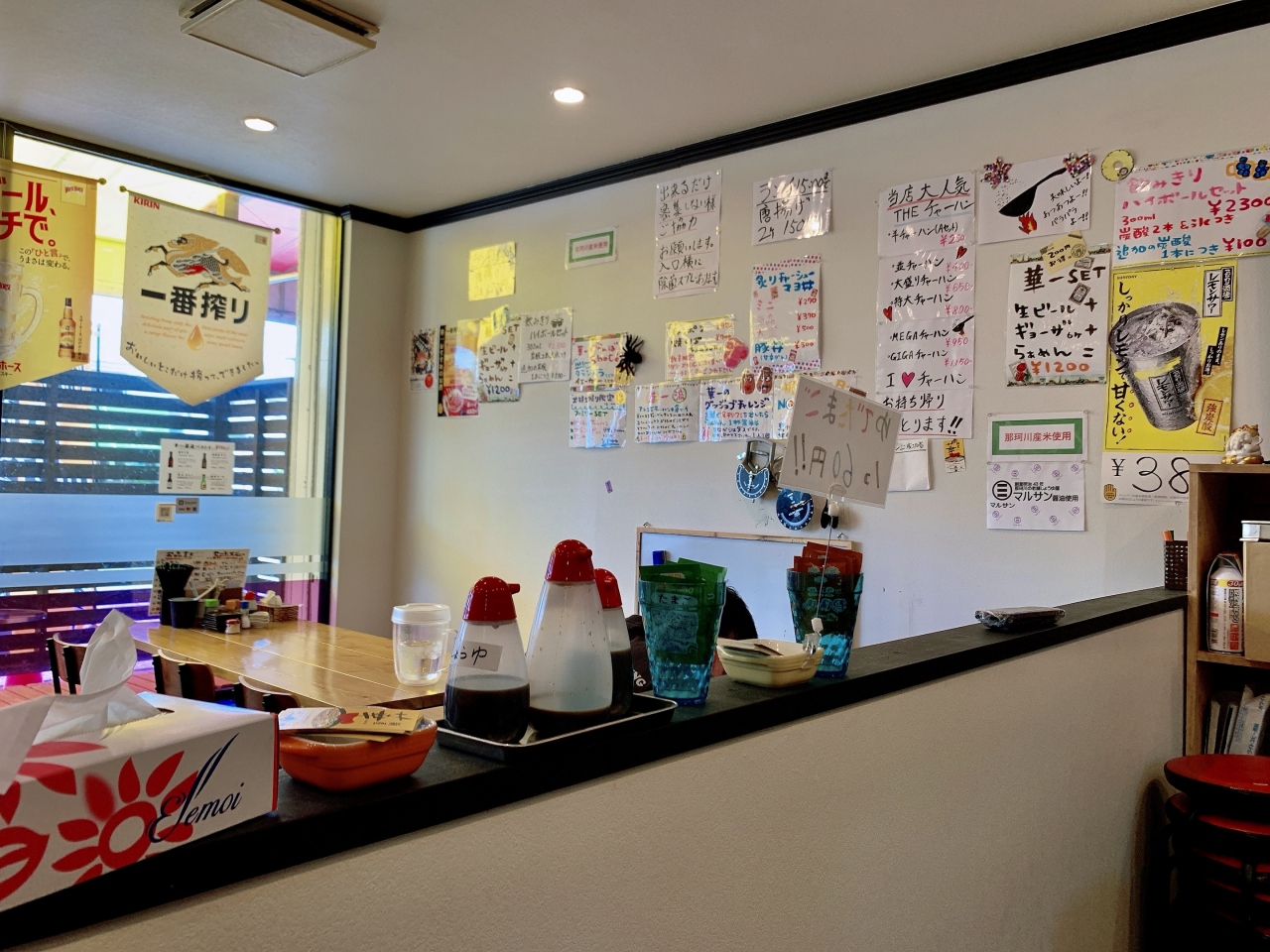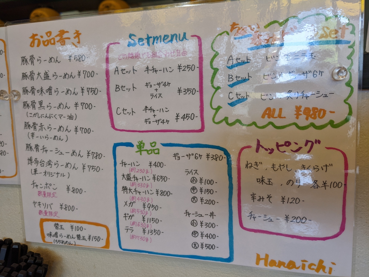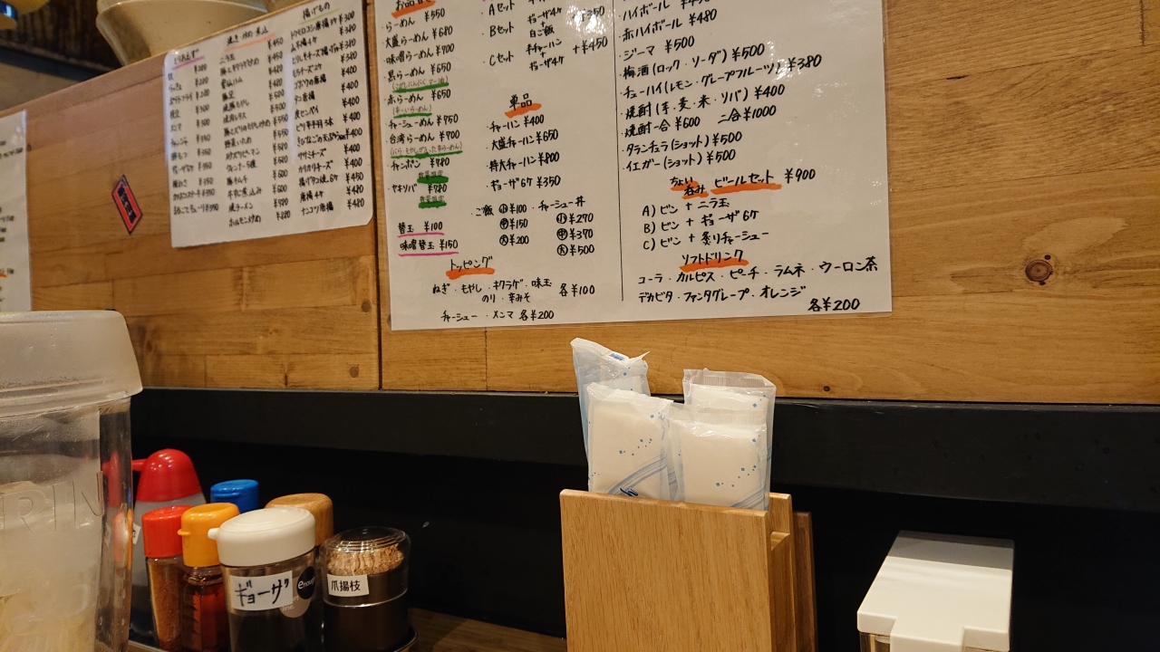 外観は飲食店が並ぶ右側の黄色いテント看板が目立つ!店内はカウンター席とテーブル席!メニューを拝見すると「ラーメン」の種類が「豚骨ラーメン」「味噌ラーメン」「赤&黒ラーメン」「台湾ラーメン」「チャンポン」「焼きそば」から「炒飯」「餃子」などを組み合わせた「ラーメンセット」などがあります。