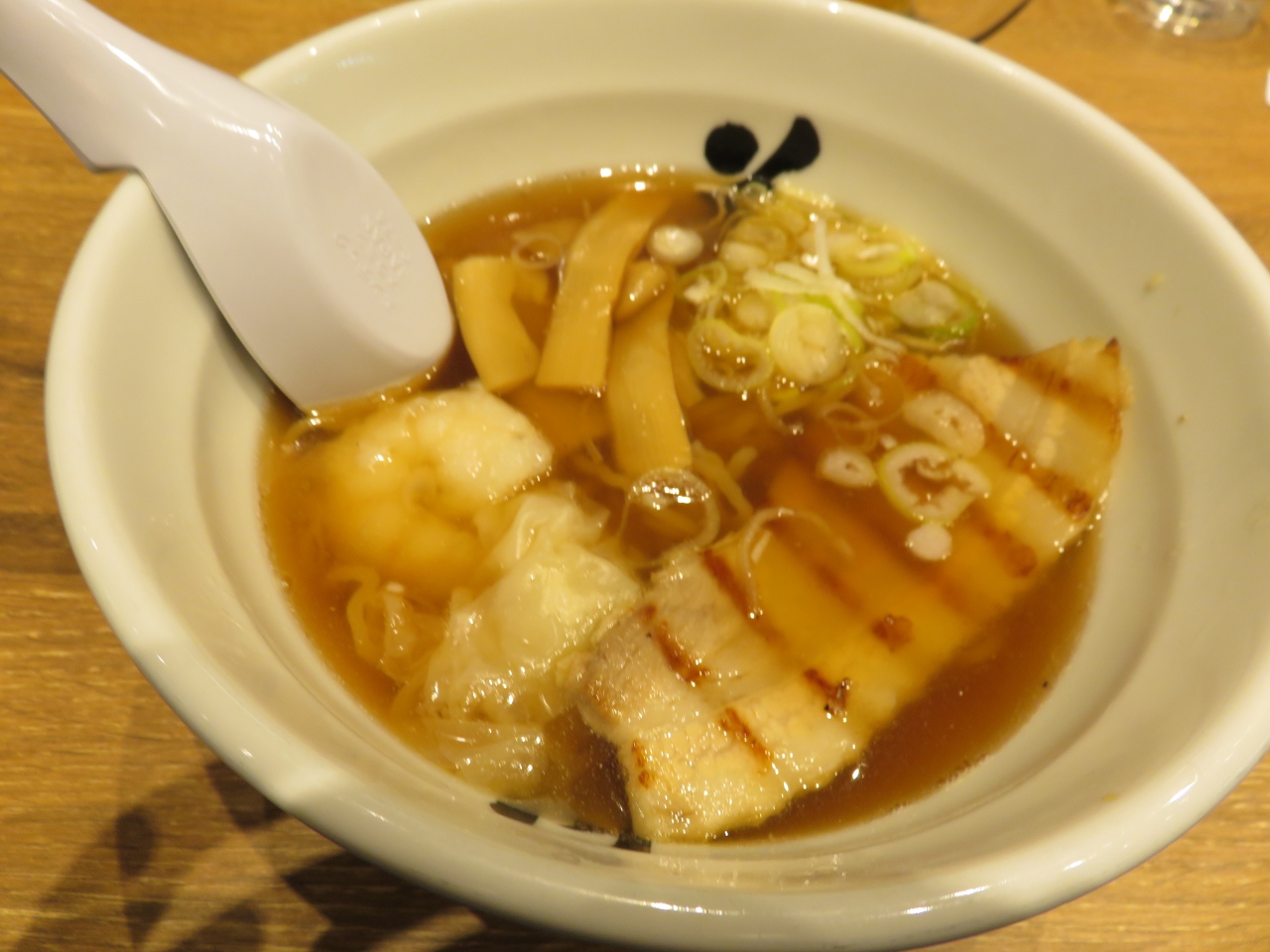 以前、山形で食べ損ねたことがあるお店でしたが、まさか福岡で再開するとは…。やはり福岡といえば豚骨ラーメンのイメージが強いのですが、ここでは敢えて醤油ベースのお店の一押しメニュー、海老ワンタン麺を注文。あっさりとした味付けで、プリプリの海老ワンタンがとても美味しかったです。