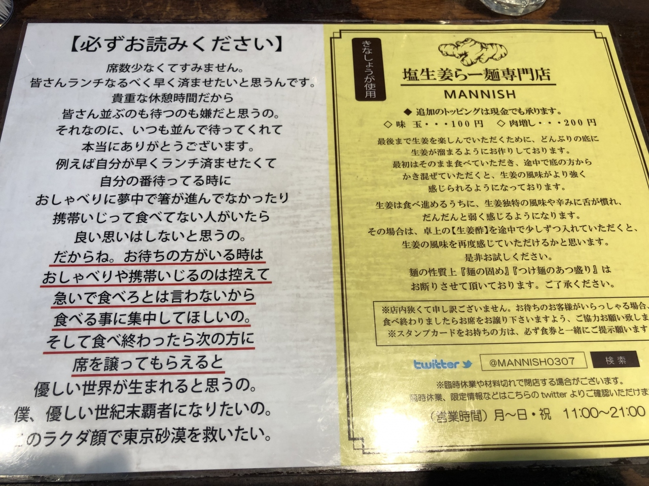 - 塩生姜らー麺専門店 MANNISH 淡路町本店