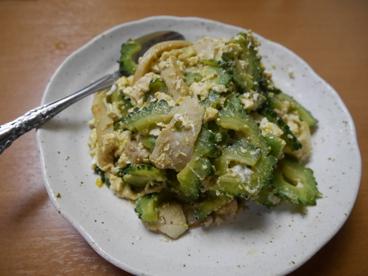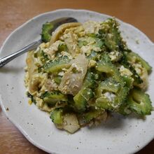 先付に続いてお刺身盛り合わせ。そのあと出し巻き玉子、海ブドウに続いて、ゴーヤチャンプルー。何を食べても美味しいです。
