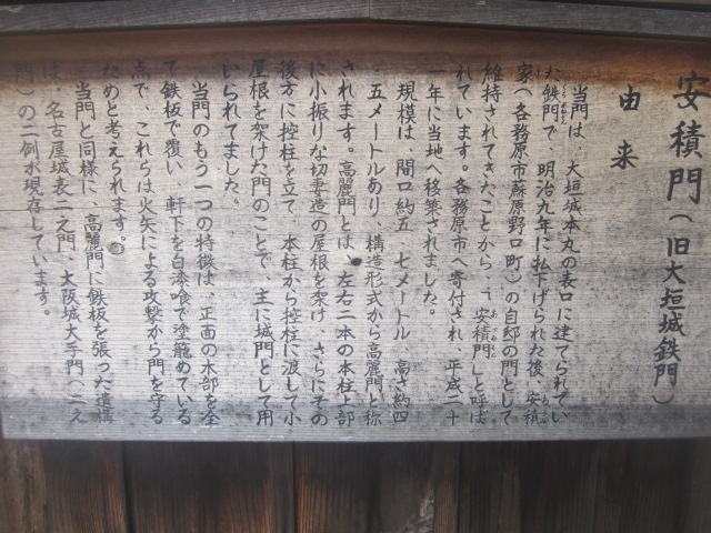 鵜沼宿探訪の最後に訪れたのがこちらのスポットで、宿場町エリアの一番東寄りにひっそりと設置されています。大垣城の城門がこんな... 続きを読む離れたところに何故、と不思議に思ったのですが、どうやら、明治期に各務原の安積家に払い下げられた後、自邸の門として使用されていたのが、各務原市に寄贈されて、現在地に移設されたという経緯のようで、安積門という別名でも親しまれています。