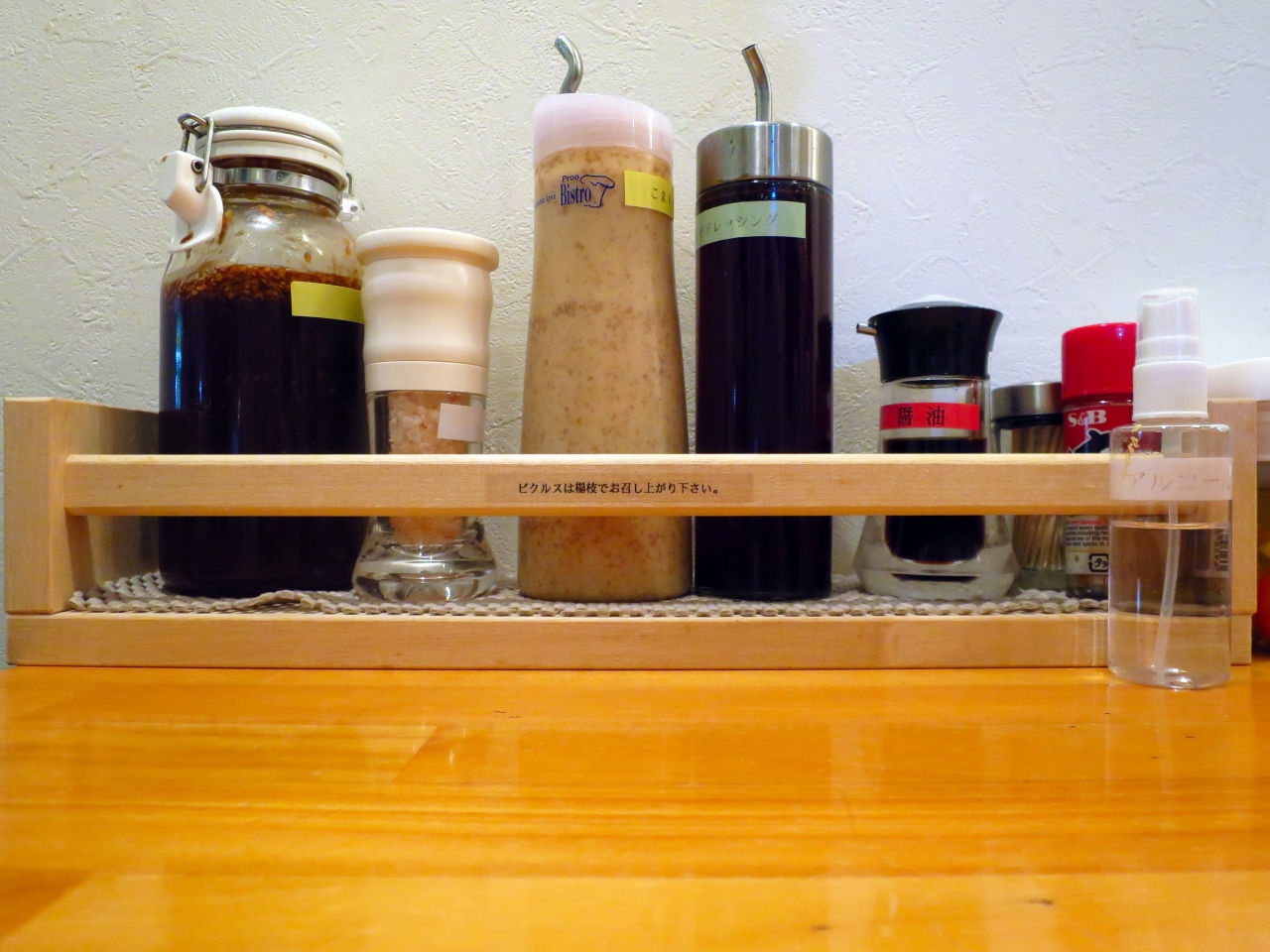 入り口の券売機で食券を購入します。基本的に給仕と食器の返却、水はセルフサービスです。トンカツへのトッピングは、定番のソースだけでなく大根おろしやワサビ醤油など様々なものが用意されています。