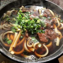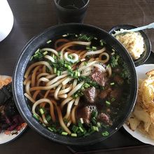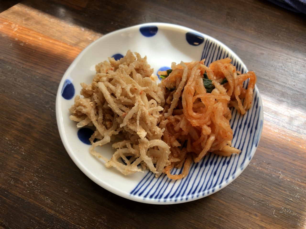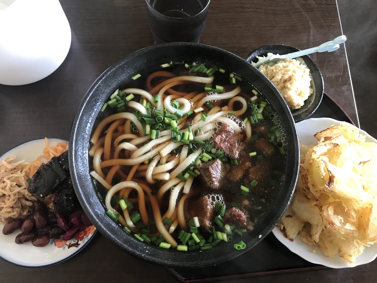 小倉発祥の牛すじうどんとおすすめと聞いた玉ねぎの天ぷらを注文。お店の真ん中には惣菜が数種類置いてあって食べ放題。切り干し大根や豆の煮物など家庭的な味が味わえる。