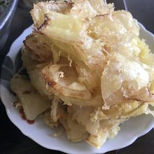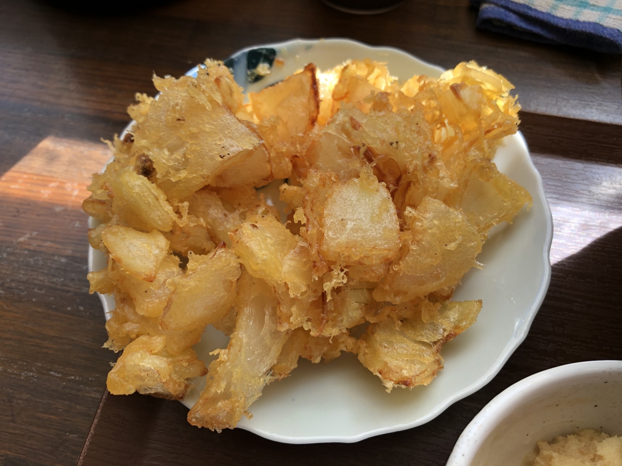 うどんと天ぷらが到着。うどんのスープは黒くて甘いが、くどく無く飲み干せる味。また、牛すじはトロトロしているが、余計な脂分を除いているようで、食べやすい。後で胃にもたれない。うどんも柔らかくて美味しい。また、玉ねぎの天ぷらは玉ねぎだらけのかき揚げ。うどんに入れても良いし、ソースで食べても良い。玉ねぎの甘さがしっかりあってこれにもハマってしまった。