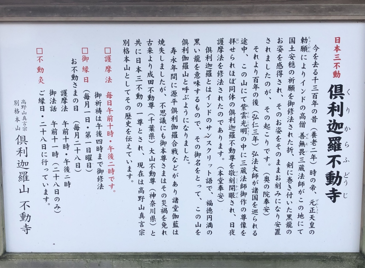 案内によれば、倶利迦羅不動寺の創建は718年、元正天皇の勅願により中国から渡来したインドの高僧、善無畏三蔵法師が倶利迦羅不動明王像を奉安したのが始まりと伝えられてる。また、それから約100年後の812年に、弘法大師が諸国を巡る途中で不動明王を拝まれ、自ら本尊と同体の不動尊像を彫り、御前立の不動尊として安置されたという。高台にあり周囲の眺めも良く、見どころも多く、ゆっくり散策することをお勧めしたい。 閉じる投稿日:2021/09/24