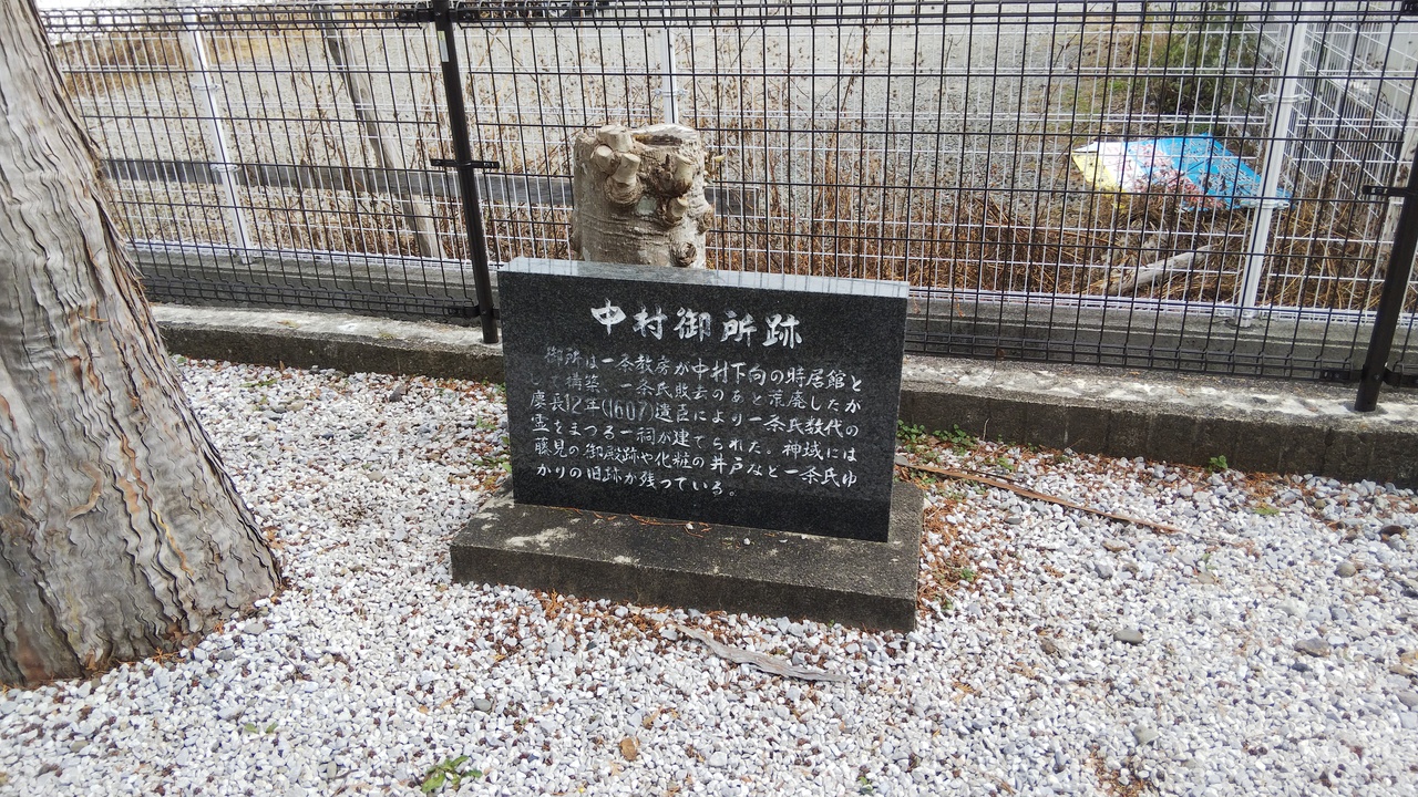 中村御所跡に建てられてはいますが、中村御所の遺構は残っていません。残っているのは女房衆が使っていたという化粧井戸くらいです。御殿は一條神社のある森山を中心に、藤棚の西側に御殿、政務を執る政所は今のマルナカあたりにあったようなので、仕方ないのかも知れませんが。