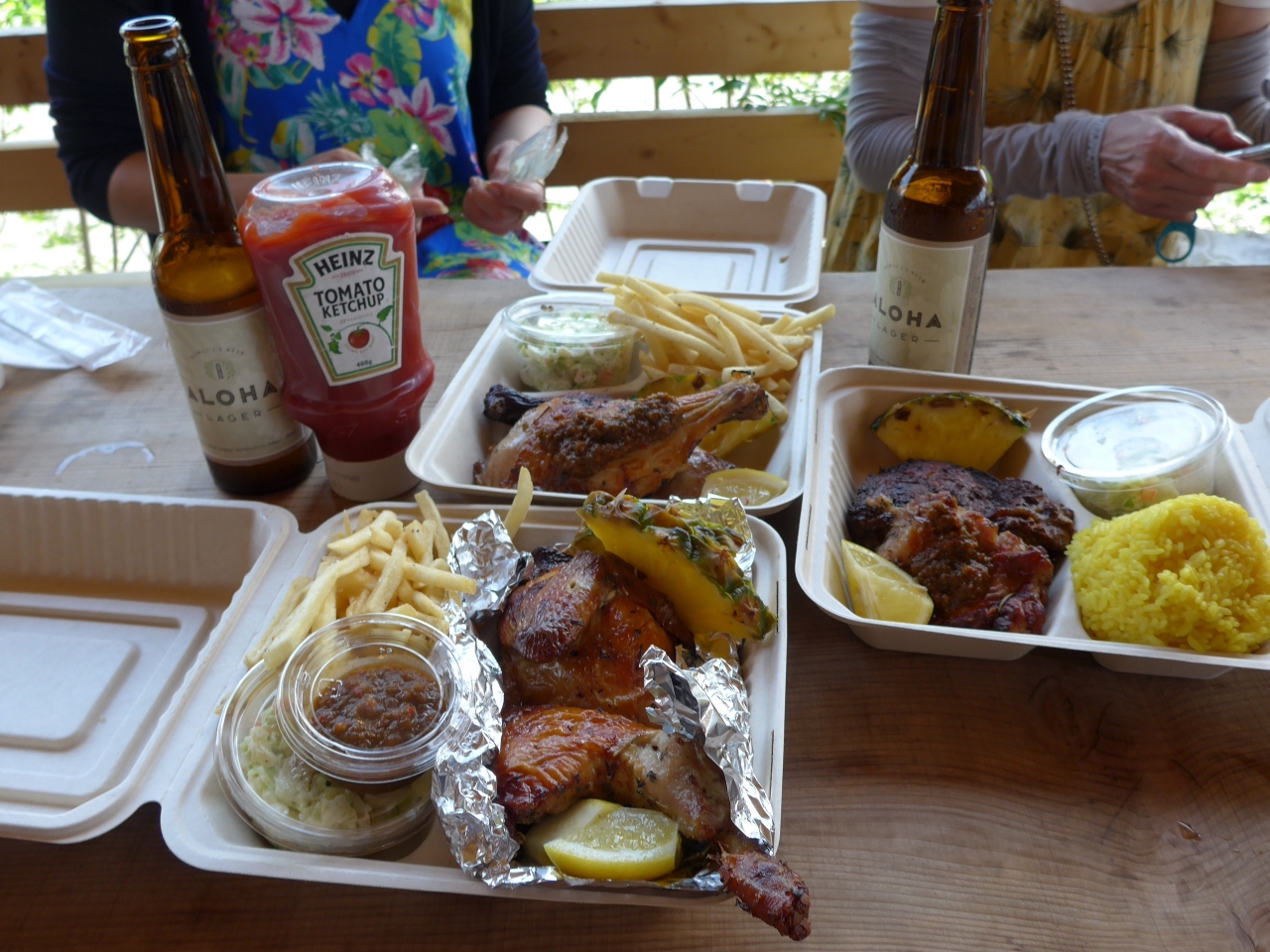 テイクアウトだけでなく「イートイン」もOKですが・・・今回はテイクアウトで「2羽」頂きました!家に帰ってハワイの気分を味わいながらゆっくりと食してみよう〜家に帰ると「美味しい食べ方」にの説明の通りオーブンにて15分くらい温めてキッチンハサミで部位を切り分けパクリっと〜美味しいやん!そのままでも十分に美味しいけど「ジャークソース」をかけると「ジャークチキン」になります〜など自分好みで食せるところも良いね!こんがりと焼き上がった皮はパリパリ!身は柔らかくジューシー食べ応えもあり美味しかった。