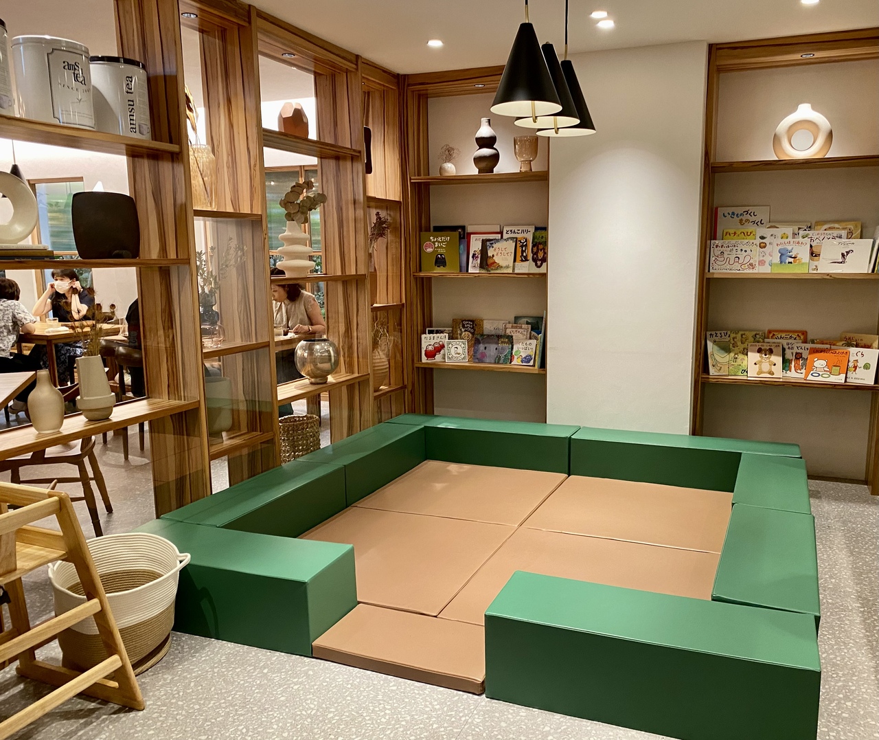 絵本が並んでて子供が遊べるスペースも。ハイチェアも用意して有りました。