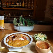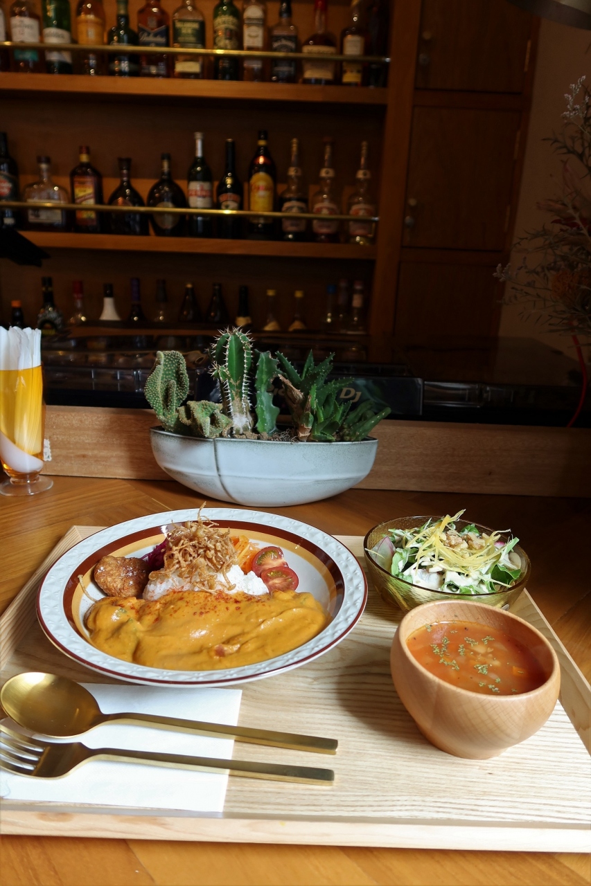 国際通り近くのカフェ&バーです。ランチでお邪魔しました。ヴィーガンカレーを注文。スープとサラダ付。カレーは、かぼちゃベース... 続きを読む。かぼちゃだと甘いんかと思ったら、程よくスパイスが効いていました。かぼちゃさんが、ナッツ並みに、少々お固く歯ごたえありましたが8-> サラダと別に、カレー皿にもお野菜のマリネとファラフェル添え。