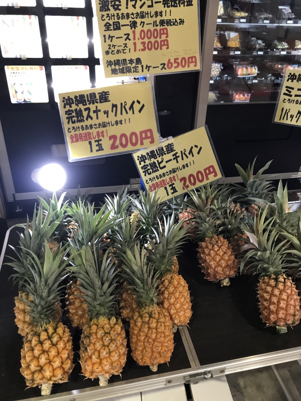 「農連野菜売場」(早朝ゾーン)の惣菜店「備瀬商店」には、パイナップル、豚皮スナックトンピー、鶏皮、惣菜が並んでいました。パイナップルと豚皮スナックトンピーを購入しました。