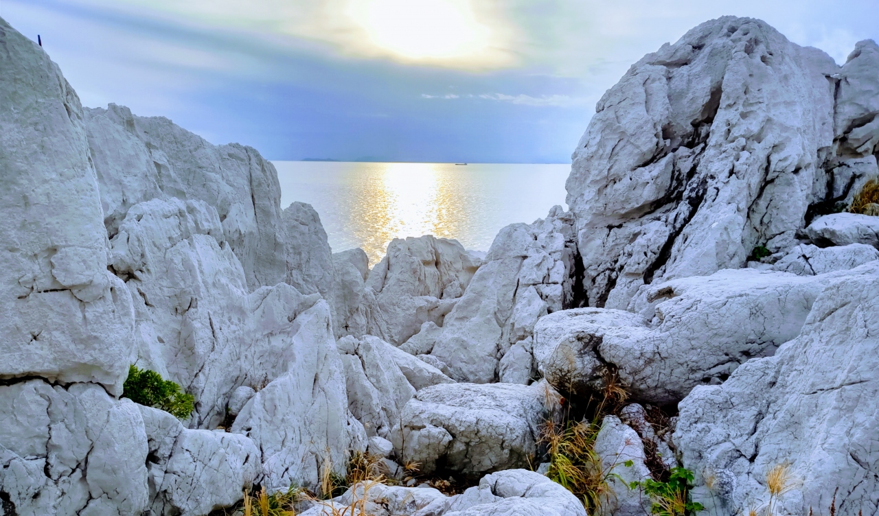 見晴らしが良く、水平線を一望。石灰岩の白と海の青色のコントラストが絶景。 夕方には水平線に夕陽が沈みます。ここから見える夕陽は「夕陽100選」にも選ばれたきれいな夕陽が見えます。