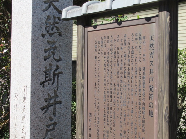 立春が過ぎ関東では一番早く春の花の観光スポットが点在している房総半島の城下町「大多喜」にやってきました。訪問して初めて知っ... 続きを読むたのですがここ大多喜は「国内初の天然ガス発祥の地 」とのことで発見され場所が大多喜駅から県道231号を南に向かって約800mにあるバス停「上原」前に「天然瓦斯井戸発祥之地」として建っていました。えぇ~ここがそうなのって感じでしたが国内初は感動しますね。しかしご安心を、大多喜駅駅前には天然ガスの開発や供給の歴史をパネルやモニターで紹介している「天然ガス記念館」があり趣のあるガス灯も建っています。是非ご覧なってくださいね。 閉じる