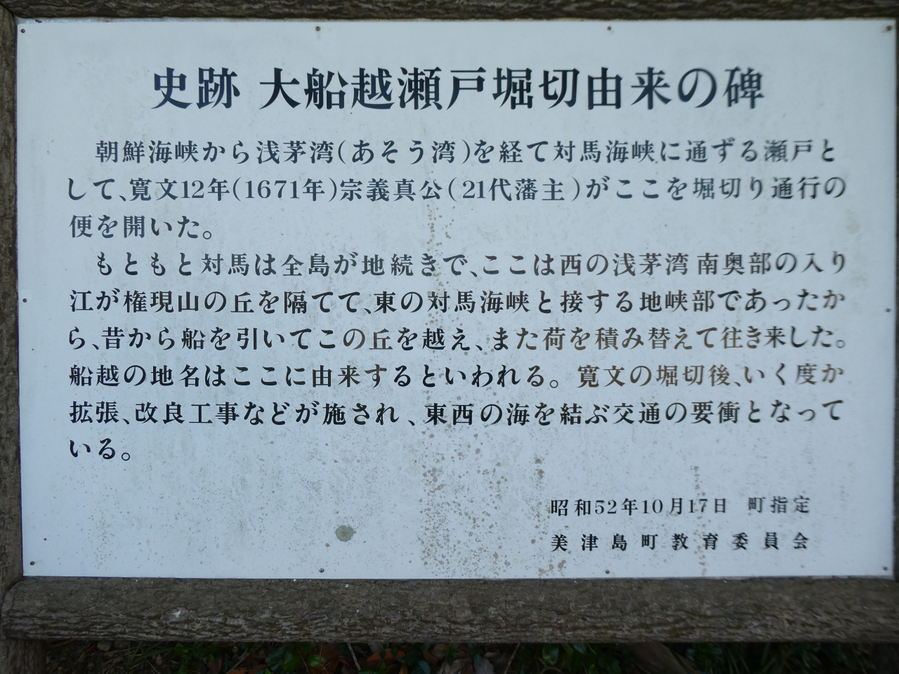 長崎県対馬は南北長い島なのですが観光地として有名な万関瀬戸は明治時代に軍艦を道す為に造られた東西の運河でこの大船腰瀬戸は江... 続きを読む戸時代1671年(寛文12)に対馬21代藩主・宋義真によって東西の船の行き来を楽にする為に作られた運河です。