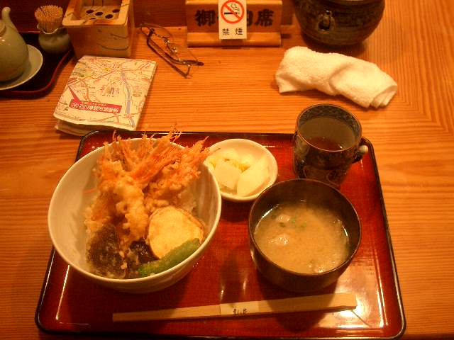香林坊の日本銀行うらの「割烹むら井」。10食限定の甘エビの天丼。大き目の甘エビで”ヒゲ”から”尻尾”まで、こりこりいただけます。名物品ですが、地元サラリーマンは、刺身定食とか、てんぷら定食とか、豪華なものをいただいています。そう、サラリーマンの昼食どころなのです。有名タレントの色紙もかかっていました。