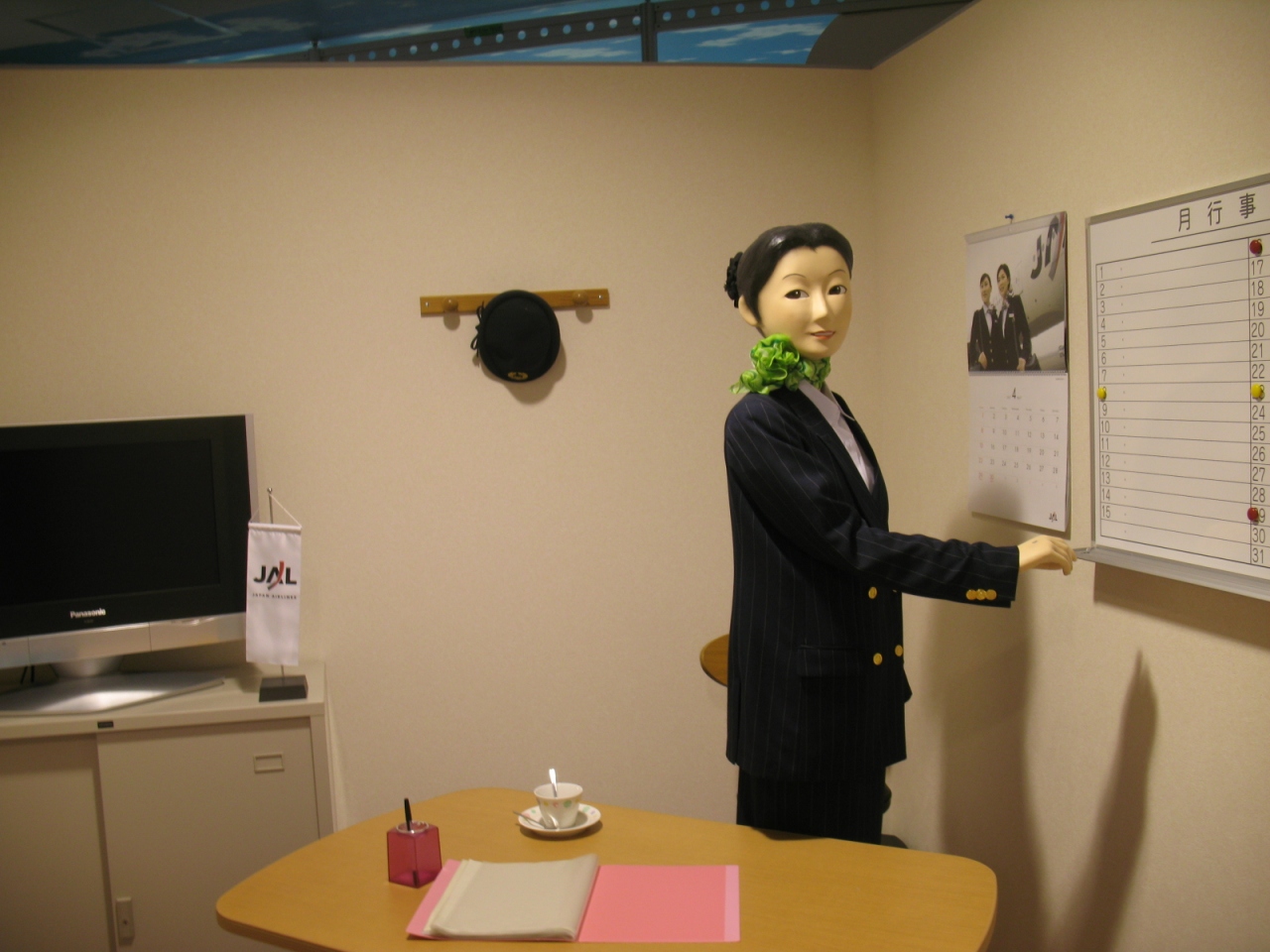 旅客機の操縦席や客席、乗員控室なんてのもあって、こんなスチュワーデスのおねいさんがお出迎えしてくれたりします。