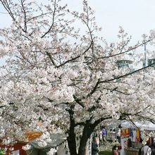 毛馬桜之宮公園(けまさくらのみや)は大川の毛馬洗い堰から下流の天満橋まで、全長約4Kmの両岸の河川敷を利用した河岸公園で大阪の桜の名所だ。4700本の桜並木の下を毎年大勢の人が散策する。特に造幣局の通り抜けに沿って桜並木が続く右岸側にはお祭りの縁日のようにお好み焼き、たこ焼き、だんごやなどの露店が並ぶ。