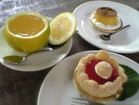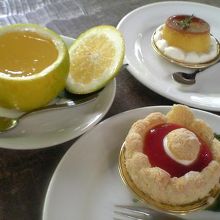 ニューサマーオレンジのゼリー550円、プラムのムース350円、かぼちゃのプリン320円。