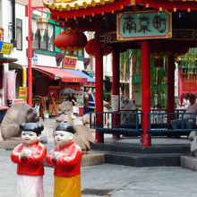 あずまやの前では二体の中国人形 財財君・来来ちゃんが迎えてくれます。