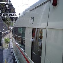 6両編成のEXE以外のロマンスカーは、先頭部がホームをややはみ出した形で停車します。