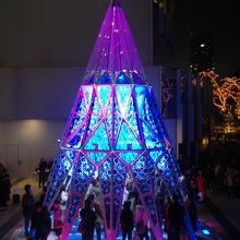 光の森を抜けると、そこは大きな青いLEDの湖が広がり、江戸きり子をイメージしたという美しいツリーが目を楽しませてくれます。