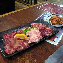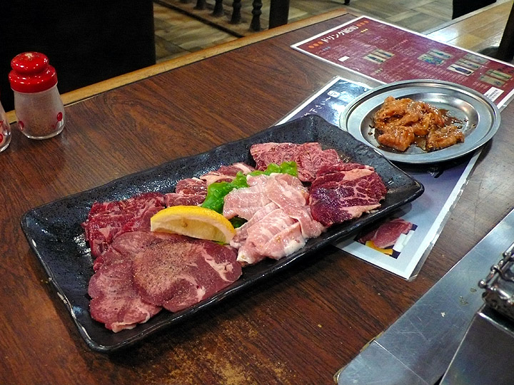 写真は何種類かのお肉が入ったプチなんちゃらセット(※右側のミノは含まれません)。お値段は、1280円か1980円のどちらかです(酔ってたのせいか、正確な値段とセット名を忘れちゃいました・・・)。この中にある豚トロに感激しました!自分がお店で買う豚トロとは大違い。脂身がとっても少ない!本当の豚トロはこういうものなんですねぇ。知ってよかった。もちろん、アガリの冷麺もおいしく頂きました。