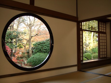 「悟りの窓」と「迷いの窓」で有名な源光庵。その窓から見る風景は紅葉の時期ならモミジも見れて綺麗です。風情のある景色ですが、天井を見ると・・・!ここは「血天井」と呼ばれています。手形、足形が今でもくっきりと見てとれます。
