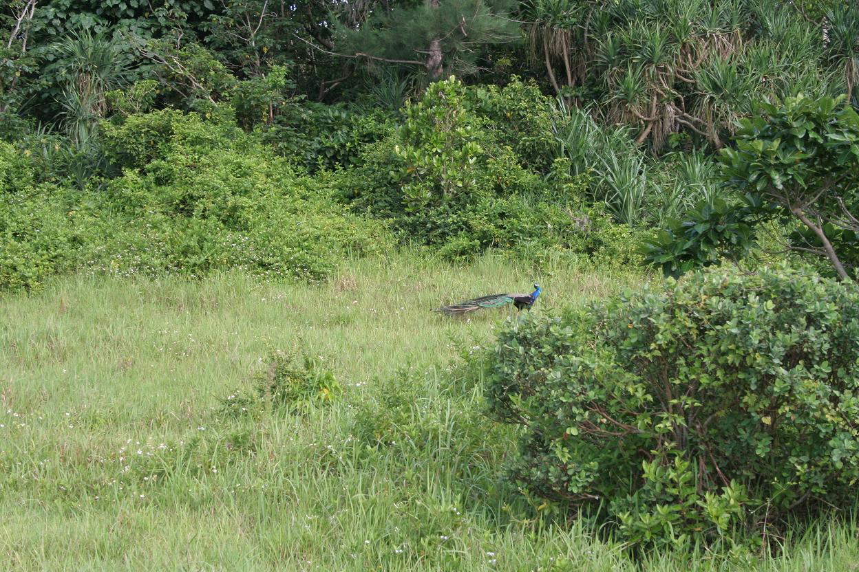5月の連休中に行きました。レンタサイクルで周りましたが、いきなり野生の孔雀がでてきて、びっくりしました。放牧されてる黒い牛がいる、のんびりとした島ですが、食事をする所が少なく、目当てのソーキそばは人がいっぱいで食べられず...残念でした。仲本海岸などのビーチはすごく奇麗です。(写真の孔雀は見えにくいですが、結構大きいです)