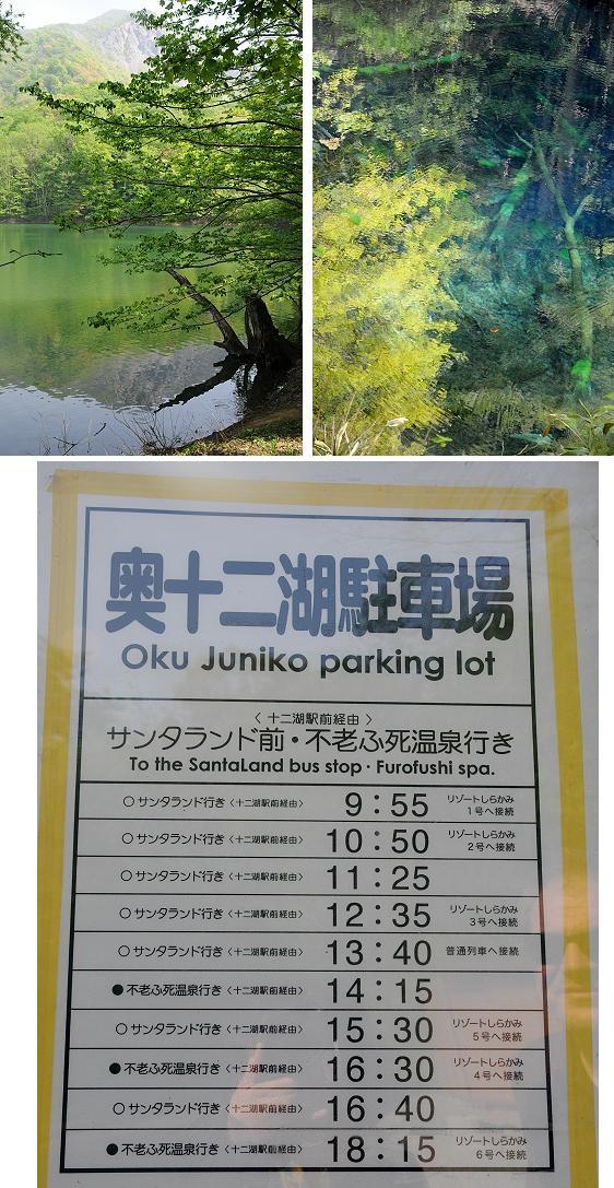 挑戦館前からは、十二湖駅経由でサンタランドや不老ふ死温泉へ行く十二湖線バスが運行されていたので、その時刻表も掲載します。(注:これは08年5月上旬現在の時刻表です)便数は少ないようなのでご注意を。