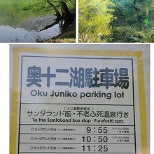 日本海沿いに走る国道101号線から十二湖への県道に入って車で10数分。鶏頭場(けとば)の池そばで道が車輛進入禁止になった所に、鶏頭場の池、青池、沸壺の池、落口の池を巡る散策コースの出発点があります。散策コースはここ以外にもありますが、青池を見てみたかったので、私たちはここに行ってみました。