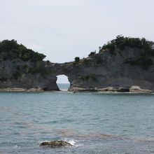 正式名称は「高島」といい、南北130m、東西35m、高さ25mの小島ですが、その真ん中に穴が開いていることから円月島と呼ばれています。