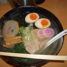 あっさり系の塩味のスープに麩を含めた7種類の具材がトッピングされた縮れ麺タイプのラーメンでした。