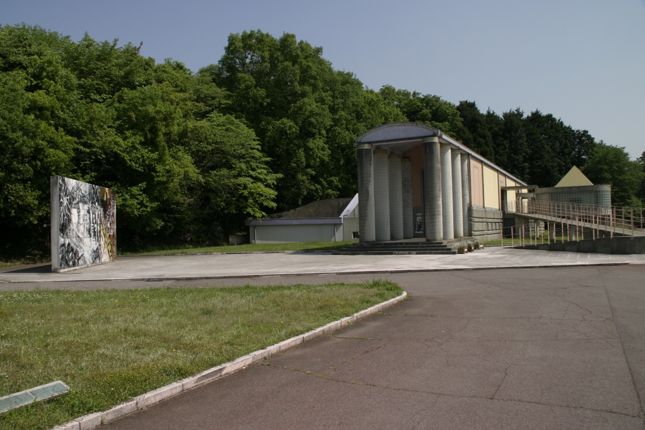 JR加古川線・日本へそ公園駅前に位置する磯崎新氏設計の美術館。対岸から見ると、駅に3両編成の列車に見えるような外観らしい。(そう見えないこともないが…)