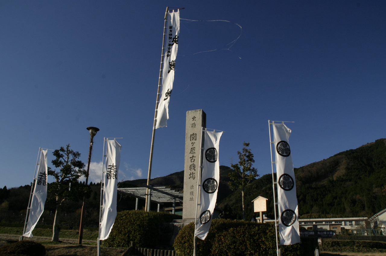 関ヶ原駅から国道365号を北上すること車で10分ほど。小学校のすぐ近くに関ヶ原古戦場跡の決戦地の石碑があります。ここから少し山手に行けば、西軍の石田三成の陣跡が整備されており、関ヶ原のまちなみ越しに東軍・徳川家康の陣を望めます。無料駐車場とトイレも完備です。