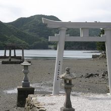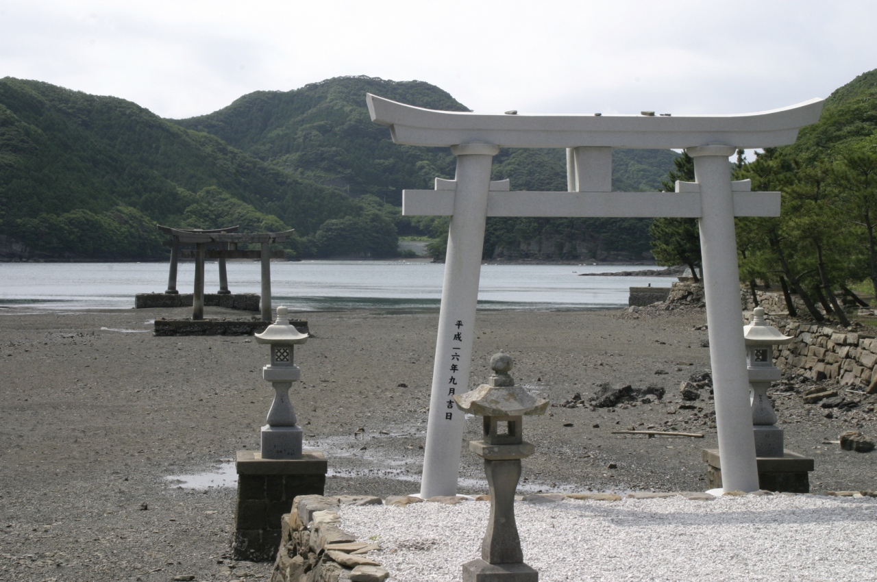 上島の豊玉町にあり、神社の本殿からまっすぐと続く鳥居の列は海の中にも立っています。満潮時には鳥居の下の部分が海面下にあり、干潮時には歩いて鳥居の傍まで行くことができます。