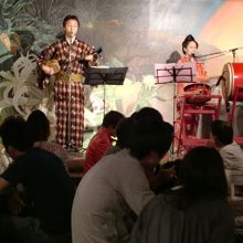沖縄古民家風の建物で、夜は2Fで沖縄料理と島唄ライブが楽しめます。
