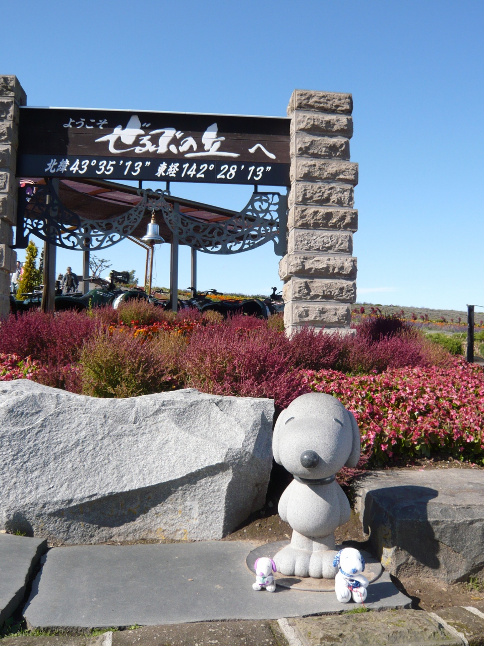 また、入口付近にある「ぜるぶの丘」と書かれた碑の横には、スヌーピーの石像がいます(=写真)。立ち寄られたら、頭を撫でてあげて下さいネ。