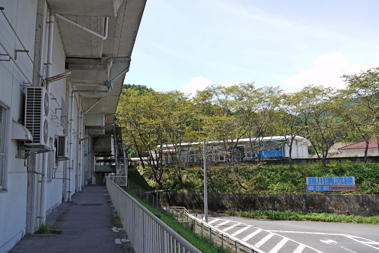 新岩国駅から線路下を4分あるくと,錦川鉄道錦川清流線の御庄駅がある.巨大な新幹線のホームと一両編成のレールバスのホームの対比がおもしろい.ちょうど列車があればここから列車で岩国まで行くのも良いと思う.