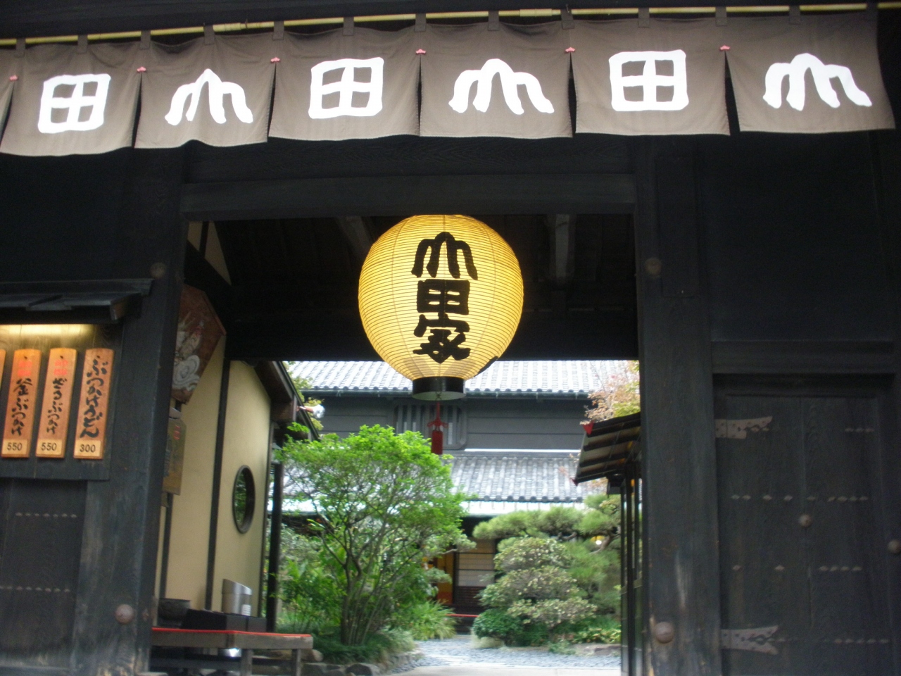 長屋門をくぐると大きな提灯がぶら下がっていて、その向こうには手入れの行き届いた日本式庭園が広がります。その奥に控える建物は、元銘酒「源氏正宗」の酒造家だった旧屋敷を、現ご主人の山田潔氏がうどん屋に改良したものだそうで、築130年以上もの、しかも登録有形文化財にも指定されているという立派な建物なのです。