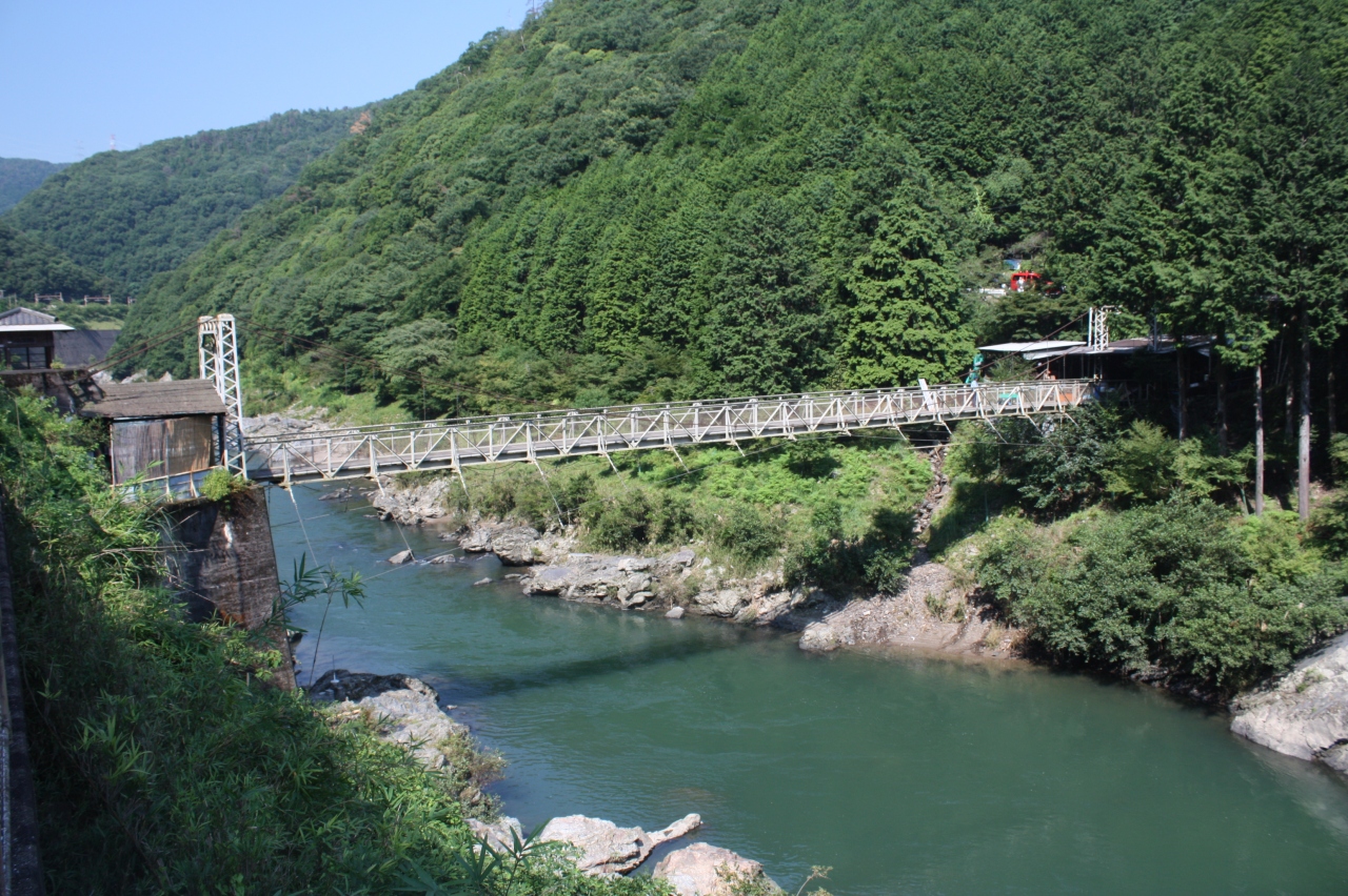 写真の吊り橋は「鵜飼橋」と呼ばれており,駅と対岸を結びます。