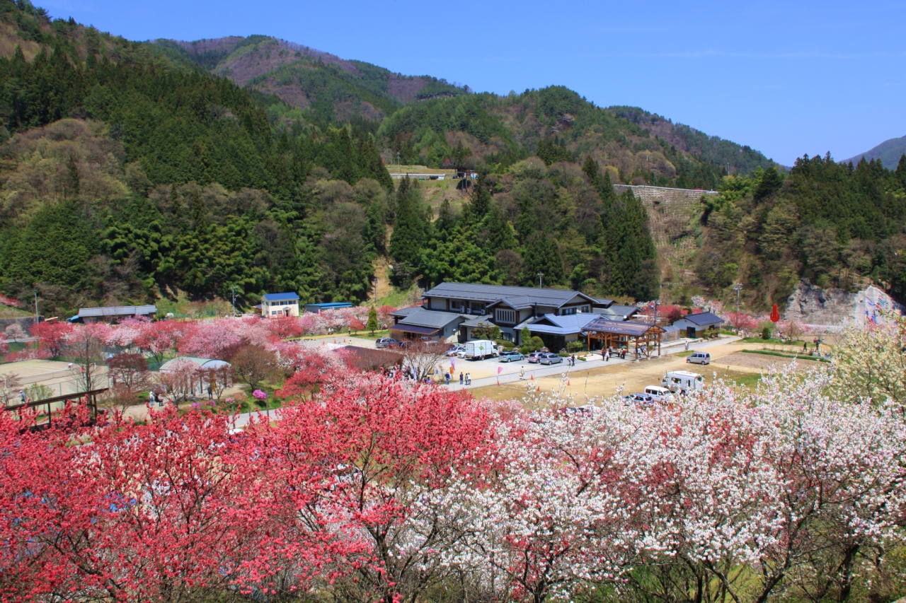 ■赤・白・ピンクの三色に咲き分ける花桃が満開。「はなももの里」月川温泉の絶景。