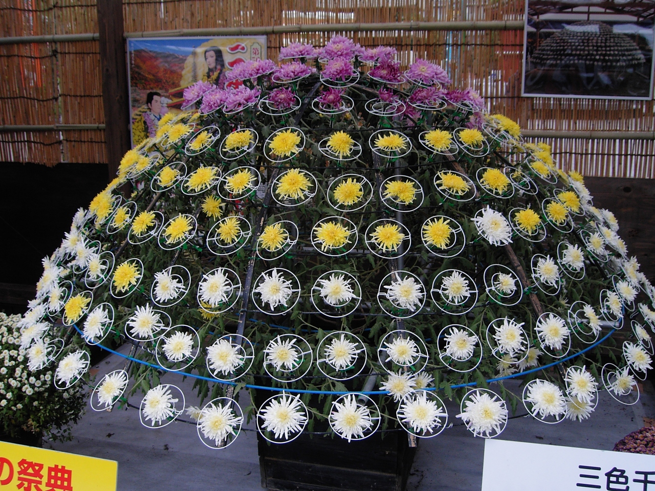 外国産のヨモギを台木(接ぎ木の台にする木)にし、赤、白、黄色の菊を接ぎ木し栽培。と。
