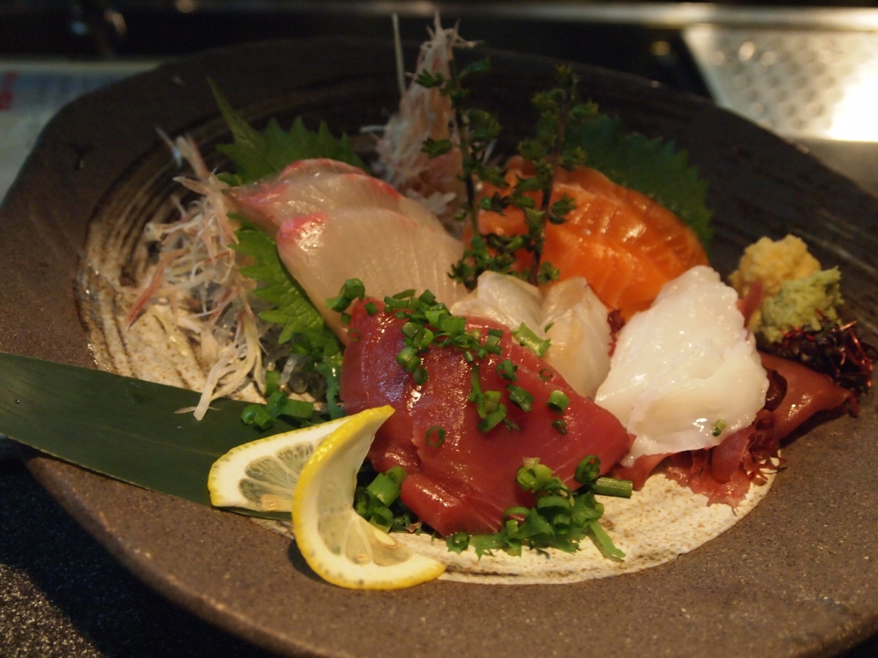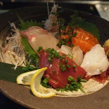 料理はオープンキッチンで若い女性がテキパキ作ってくれて、なかなか美味でした。銀杏\600、合鴨ロース¥1,000、刺身5点盛り\1,700、海鮮グラタン\800、あとはマグロカマ焼き、帆立浜焼き等を注文。