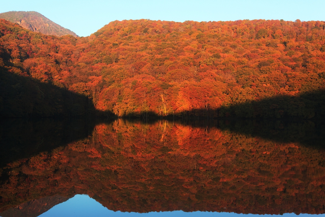 六沼については、特に蔦沼は紅葉の見ごろの晴れた日の朝には、ブナを中心とした紅葉した山が鏡のような水面に綺麗に映り込み、それに朝日が差し込むと真っ赤に染まり非常に美しい光景を見ることができます。