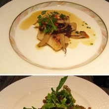 魚料理は甘鯛のソテーきのこソース、肉料理は牛ロースステーキ