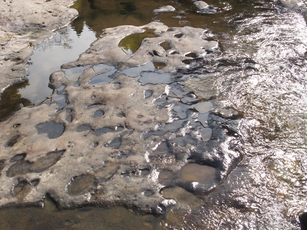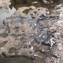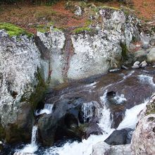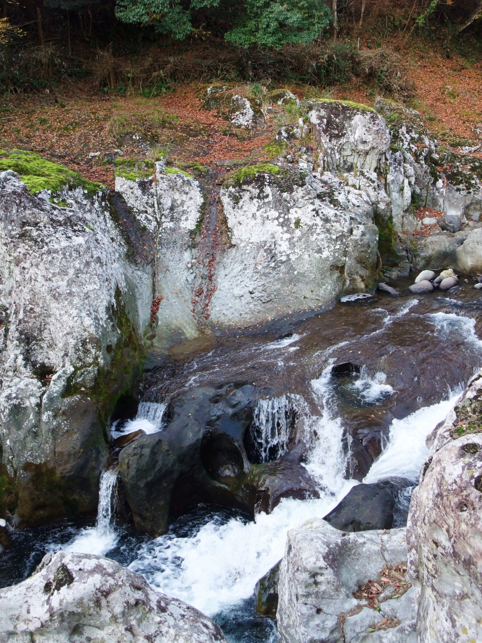 甌穴とは、地表に露出した変朽安山岩の中に含まれた礫が、同じ堅さの溶岩の窪みの中で水流によって回転し、川底に無数の穴(甌穴)を作っていったものだそうです。岩質、水量、流速と条件が揃ったときにだけ来る大変珍しい現象なのだそうです。甌穴はやがて深い大きな穴となり、隣あった穴の壁が崩れ、深い渓谷となっていくのだそうです。険しい岩壁もそのようにして出来たのかと思うと、自然の力のすごさを見せつけられるようです。