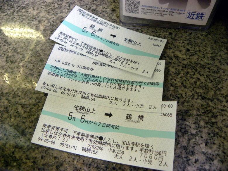 生駒山上遊園地乗り物券付き割引切符は鶴橋〜生駒〜鳥居口〜宝山寺〜生駒山上間の往復と、大人 ¥1,200−・小人 ¥800−分の乗り物券がついて大人2名小人2名で ¥7,060−とお得です。