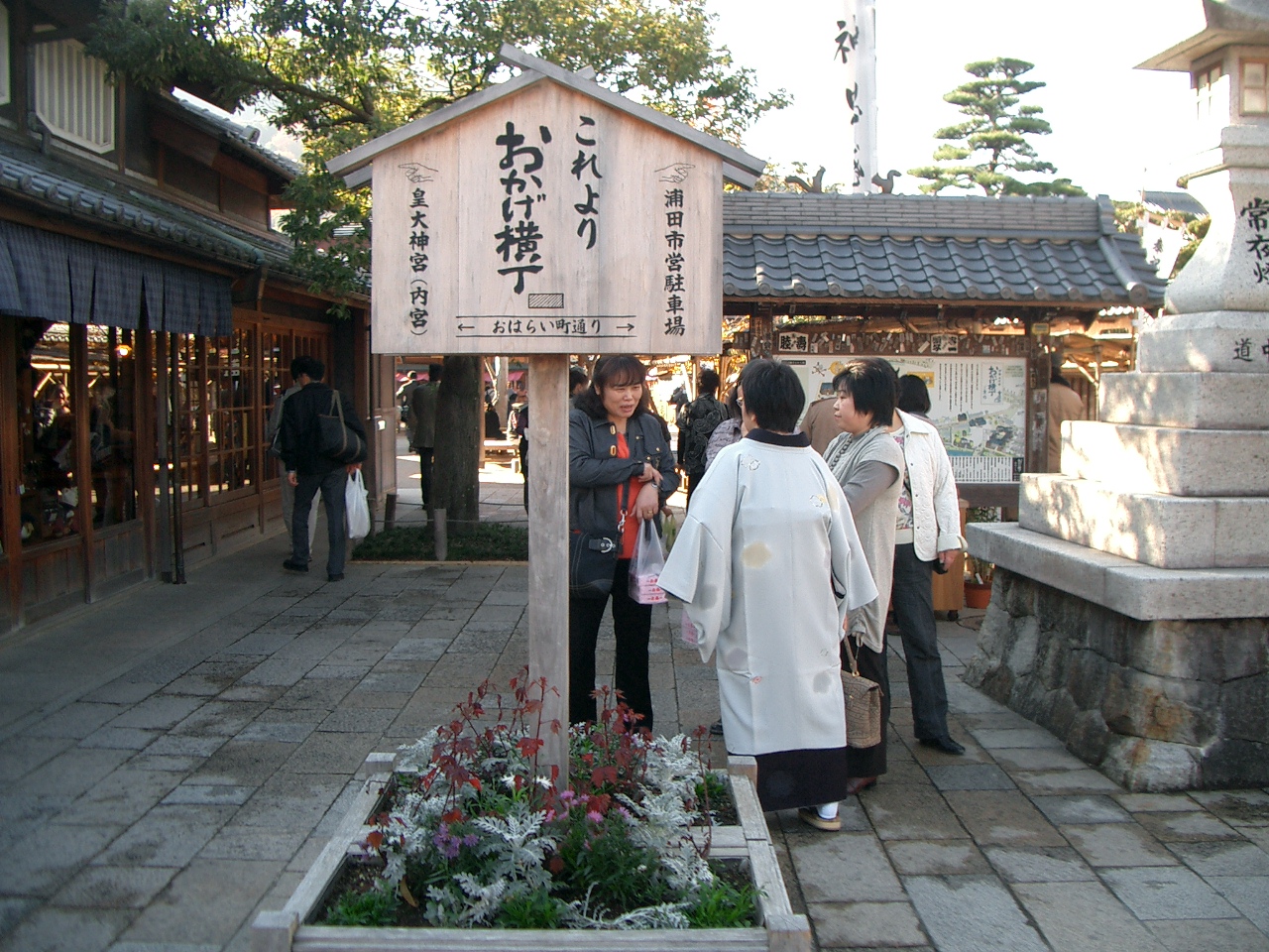 内宮の門前に栄えた商店街通りで、今では内宮参拝とセットになった一大観光地になっている。通りの長さは1km弱の距離がある。土産物屋や飲食店などが並び、昼時は平日でも凄い混雑。観光シーズンの休日は朝からディズニー並の混雑だそうだ。人気店は軒並み行列覚悟が必要。通り中央に「おかげ横丁」という‘昔の町並みのテーマパーク’様の一角があり「太鼓実演」等も楽しめる。