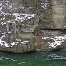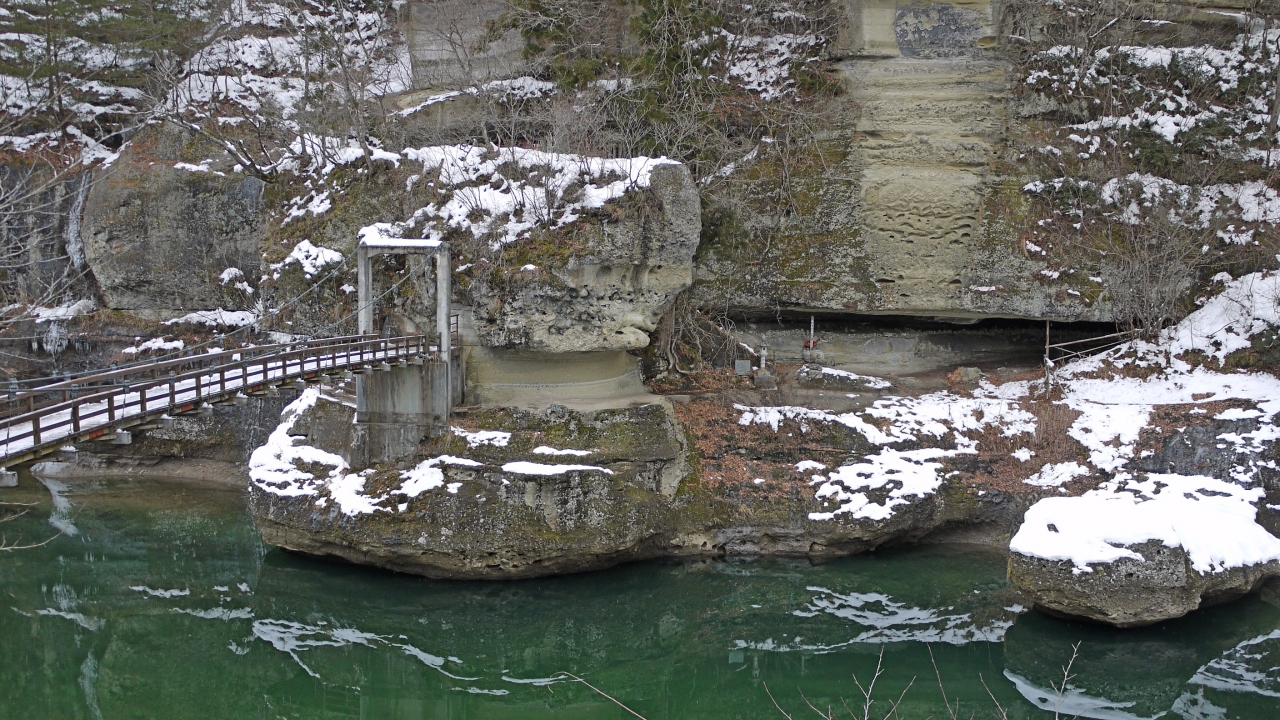 正月の塔のへつり,雪の中に阿賀川は緑色.人が全くいなくて,ピント張り詰めた空気の中に浸食された岩があった.非常にきれい.おすすめ.