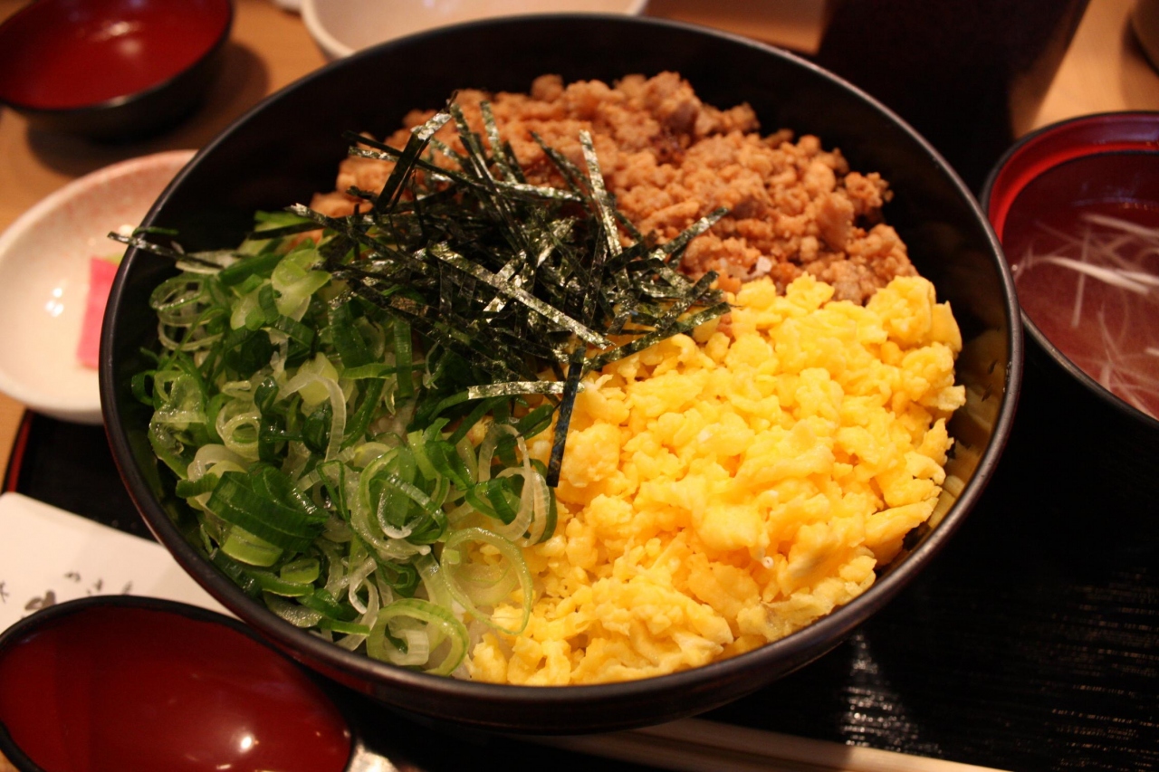 3色に綺麗に分かれた、珍しい新食感のそぼろ丼。